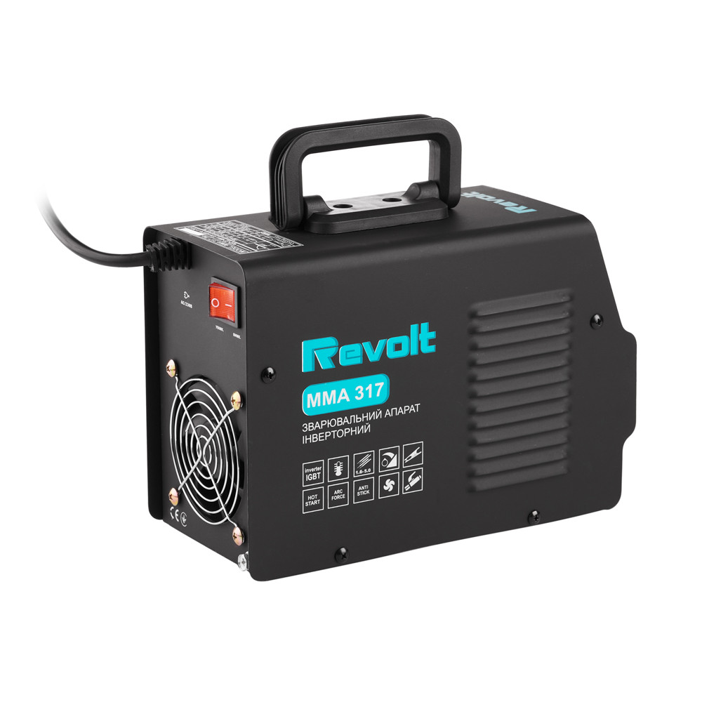 Зварювальний апарат інверторного типу Revolt MMA-317 призначений для ручного дугового зварювання різних типів металів штучним електродом, методом ручного дугового зварювання на постійному струмі. Revolt MMA-317 розрахований для побутового та напівпромислового використання. Завдяки додатковому регулюванню можна налаштовувати оптимальні параметри у різних ситуаціях. Має невелику вагу, зручну для транспортування. Великою перевагою інверторного апарату є робота зі зниженою напругою в мережі. В умовах частої нестабільності напруги в стаціонарних мережах цього пристрою буде достатньо навіть 160 для нормальної роботи. Особливості Цифровий дисплей Захист від термічного перевантаження Покращений тримач маси та електродів MIG/MAG/MMA-зварювання Функції Anti Stick, Hot Start, Arc Force Вага: 4.5 кг Потужність: 7500 Вт Робоча напруга: 160-250 В Діа. мм Регулювання зварювального струму: 20-317 А Робочий цикл (при 30°C): 100% ККД: 85%