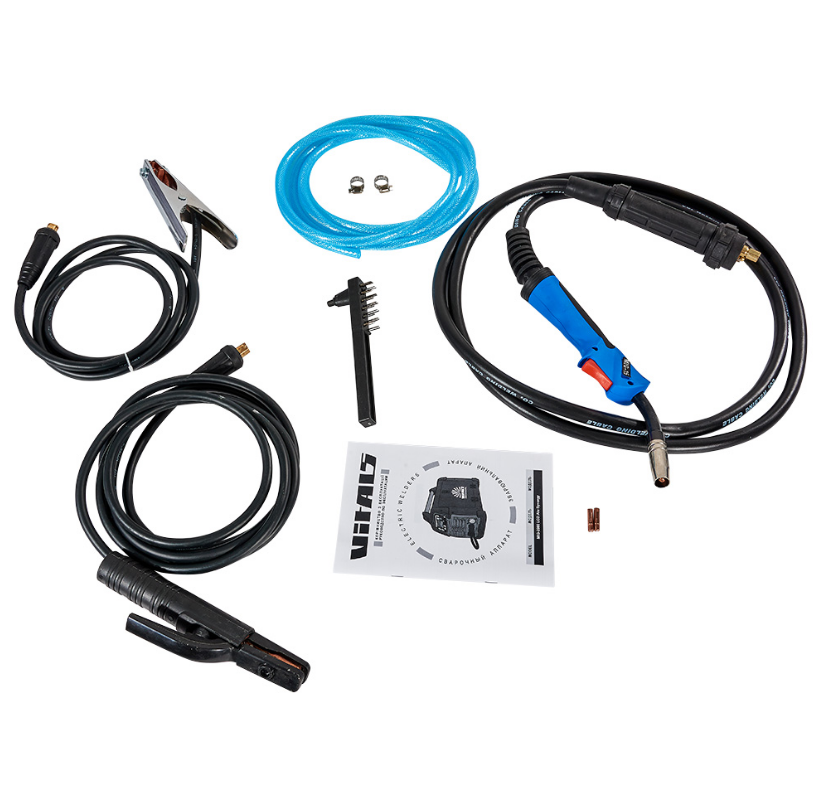 Комплектація - Зварювальний апарат; Пальник MIG 15 3 метри; Електродотримач; Зажим на масу; Газовий шланг 2 м (діаметр 8 мм); Щітка молоток; Упаковка; Інструкція; Гарантійний талон.
