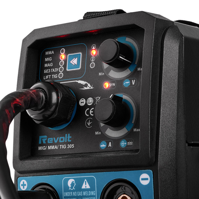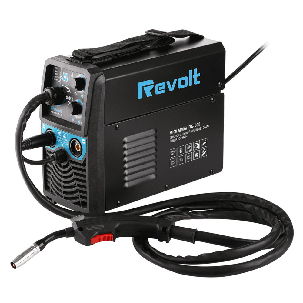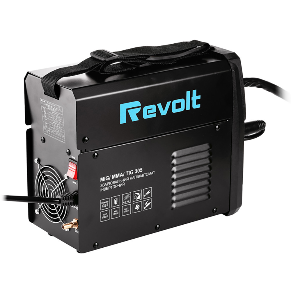 Зварювальний напівавтомат Revolt MIG 305 – професійний зварювальний апарат постійного струму. Застосовують для напівавтоматичного зварювання металевих конструкцій за допомогою плавлення зварювального дроту, на постійних показниках струму, у захисному газовому середовищі - вуглекислого газу або аргону та флюсового дроту, без застосування газу. Захист від перепаду напруги та перегріву своєчасно відключить зварювальний апарат та повідомить про це індикатор на передній панелі. Характеристики Потужність: 4600 Вт Регулювання зварювального струму: 20-305 А Діаметр електродів: 1.6-5 мм Максимальна вага дроту: 1 кг ККД: 75% Охолодження: повітряно-примусове Клас ізоляції: F Ступінь захисту: IP21S Тип: зварювальний : MIG/MAG/MMA/TIG Тип електричного струму: постійний Напруга мережі: 160-250 В Вага: 6.1 кг