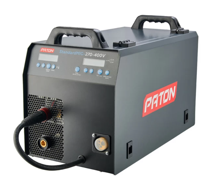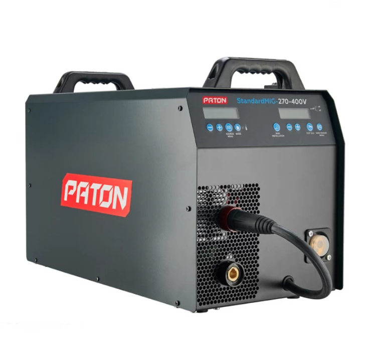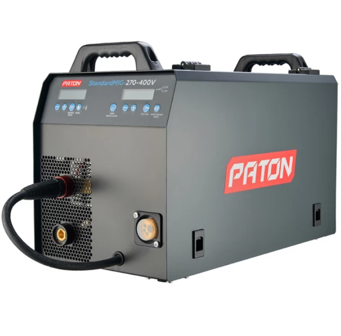 ХАРАКТЕРИСТИКИ Номінальна напруга в мережі електроживлення, В 380/400 Номінальний зварювальний струм, А 270 Тривалість навантаження (ПН) на номінальному струмі 60% Межі зміни напруги в мережі електроживлення, В 380±15% Межі регулювання зварювального струму, А2 електрода, мм 1,6-6 Діаметр суцільного зварювального дроту, мм 0,6 - 1,4 Номінальна споживана потужність, кВА 7,9-8,6 Максимальна споживана потужність, кВА 11 Клас захисту IP21 Габаритні розміри, ШxГxВ, мм 310х620х46 , кг 27,6 Термін гарантії, міс 36 ОПИС Цифровий інверторний напівавтомат PATON StandardMIG-270 – це апарат однокорпусного типу використання, призначений для ручного дугового зварювання (РДС «MMA»), аргонодугового зварювання (АРГ « «MIG/MAG») на постійному струмі серед захисних газів і сумішей. В апараті StandardMIG-270 реалізований повністю цифровий спосіб керування, за рахунок чого забезпечуються його багатофункціональність і широкі можливості точного налаштування режимів зварювання. Номінальний струм, що видається апаратом, до 270А, дає можливість працювати будь-якими електродами діаметром від 1,6 мм до 6 мм (в т.ч. тугоплавкі) і суцільним зварювальним дротом діаметром від 0,6 мм до 1,2 мм. Окремий закритий відсік для зварювального дроту покращує захист від пилу та інших забруднень, а також його конструкція передбачає встановлення котушок з дротом вагою до 15 кг. PATON StandardMIG-270 обладнаний якісним металевим механізмом подачі дроту з потужним герметичним двигуном, а універсальний роз'єм KZ-2 типу "ЄВРО" дозволяє підключати зварювальні пальники від широкого ряду виробників. Модель StandardMIG-270 у поєднанні з високою потужністю та продуктивністю, має невелику вагу та габаритні розміри. А завдяки РК-екранам апарат легко та зручно налаштувати під вирішення будь-якого завдання. Апарат комплектується якісними аксесуарами від компанії ABICOR BINZEL, які дозволяють одразу почати працювати в режимах MIG/MAG та MMA.